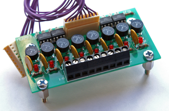 Der MGV93 enthält 8 Stromdetektoren, die das Erkennen eines Stroms über Optokoppler galvanisch getrennt an einen MGV50 LocoIO melden können. Jeder einzelene Stromdetektor hat auf der Gleisseite eine selbstrückstellende Sicherung. Eine rote LED zeigt das Auslösen der Sicherung, eine grüne LED den aktivierten Ausgang eines Optokopplers an. Über eine 1zu1 beschaltete Verbindung mit PSK-Steckkontakten wird der MGV93 an eine Port-Hälfte eines MGV50 angeschlossen. Im Bild oben sind das die Steckergehäuse mit den violetten Drähten.